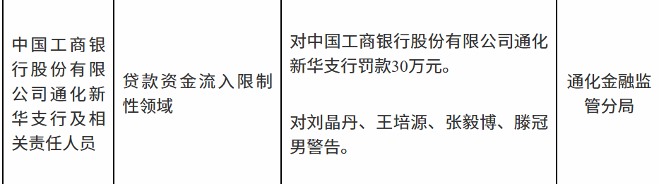 1月6日,国家金融监督管理总局通化监管分局行政处罚信息公示列表显示,中国工商银行股份有限公司通化新华支行及相关责任人员因贷款资金流入限制性领域被罚款30万元。刘某丹、王某源、张某博、滕某男被警告。